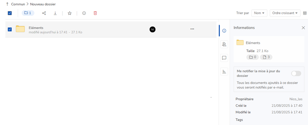 - Les élements d'identification du propriétaire, de création, de modification et d'éventuels tags posés sur le dossier