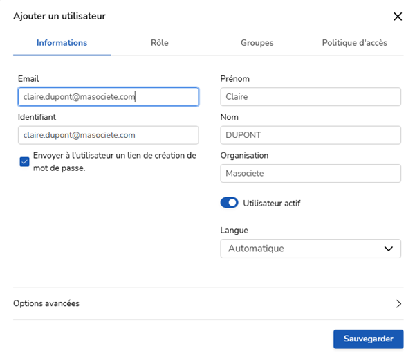 La case Envoyer à l'utilisateur un lien de création de mot de passe est cochée par défaut: la plateforme va ainsi envoyer un mail au nouvel utilisateur pour lui indiquer qu'un compte vient de lui être créé et qu'il est invité à choisir un mot de passe pour sécuriser son accès.
