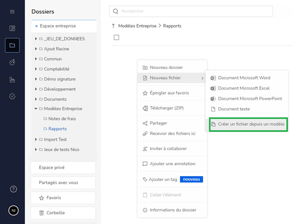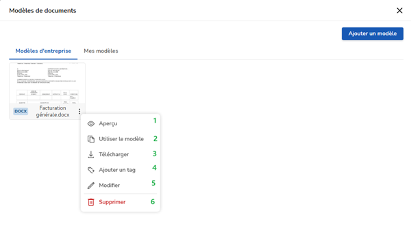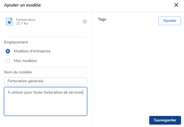 Vous possédez des modèles de document, qui doivent être utilisés par les collaborateurs de la plateforme (facture, rapport, notes de frais…), vous pouvez alors les inclure, au sein même de votre plateforme, comme modèles d’entreprise.