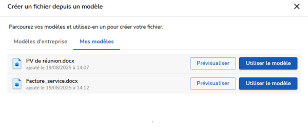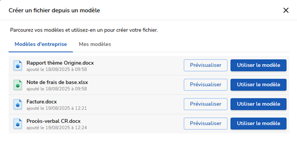 Votre organisation a peut-être déjà prévu des modèles de documents types, à utiliser, lors de la création de document. Ces modèles sont alors accessibles directement, afin de créer un document depuis l’existant.