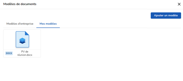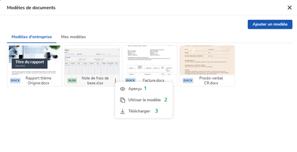 Repérez, en haut à droite de votre page, le bouton puis cliquez dessus. Vous sont alors, proposés les modèles préalablement créés pour l'entreprise.
