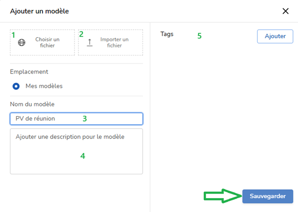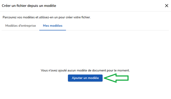 On vient cliquer sur l’élément entouré de vert, pour ouvrir la fenêtre suivante, puis se placer sur l'onglet Mes modèles
