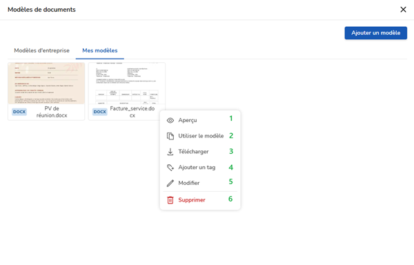 Rapports, synthèses, notes de frais, factures, courriers à entêtes, utilisez les ressources de votre plateforme afin de gérer vos modèles.