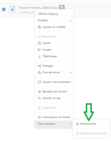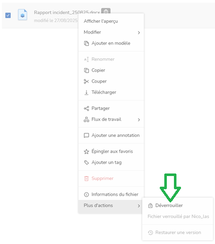 Est alors indiqué le nom de l'utilisateur verrouillant le fichier mais vous donnant également la possibilité de déverrouiller le fichier en question.