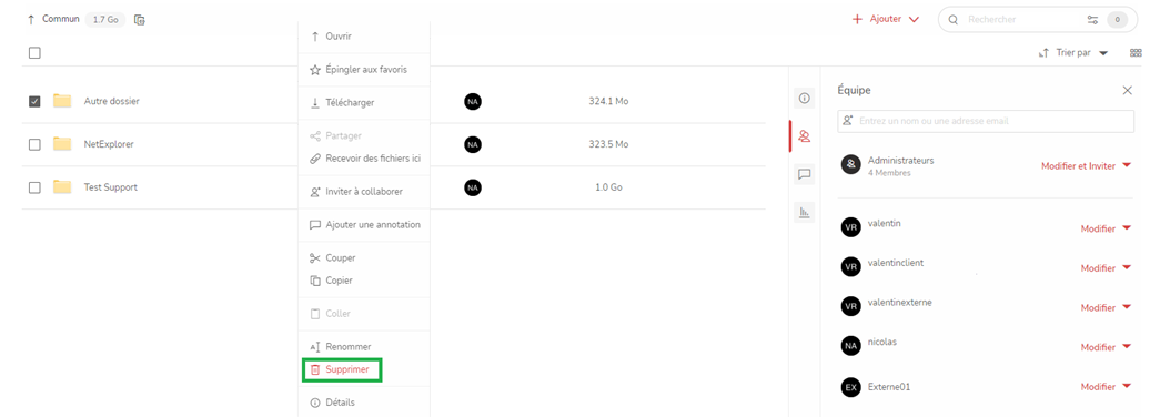 Voici comment cela se passe, dans cet exemple, un dossier, qui donne des droits à 5 utilisateurs différents, est envoyé à la corbeille.
