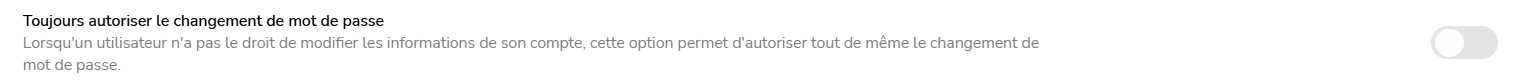 Si vous souhaitez rendre indépendant votre utilisateur pour son mot de passe uniquement, vous pouvez activer l'option Toujours autoriser le changement de mot de passe dans la configuration de votre plateforme rubrique Sécurité menu Mot de passe. Ainsi il pourra recevoir un mail de réinitialisation de son mot de passe et en définir un nouveau sans faire appel à vous.