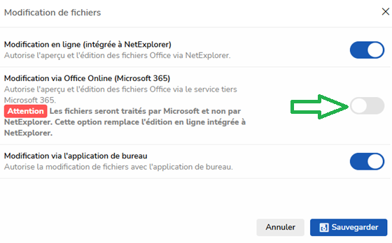 Cochez simplement le paramètre montré, ci-dessus, afin d'affecter l'édition en ligne à Microsoft Office Online.