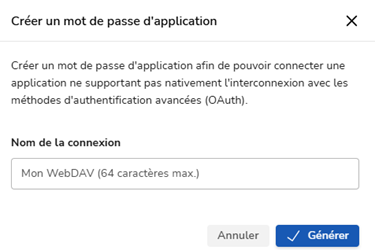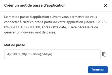 Le "Mot de passe d'application" permet d'interconnecter des applications NetExplorer comme NetSync, le connecteur Outlook ou un lecteur réseau WebDAV avec: