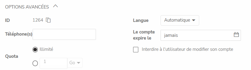 - Vous avez aussi la possibilité de définir une langue par utilisateur. Sur la fiche d'un utilisateur, dans les Options avancées, la rubrique Langue permet d'attribuer une langue par défaut à l'utilisateur.