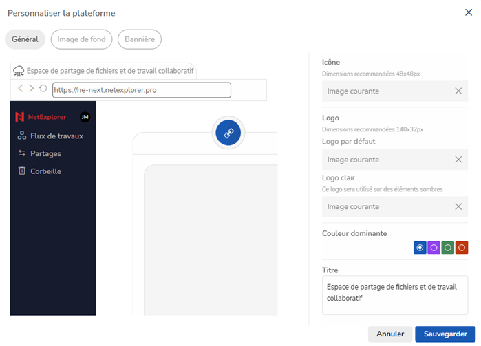 Dans l'onglet vous allez pouvoir choisir l'icone de présentation, le logo de votre société, le titre de présentation et les couleurs dominantes de votre plateforme.