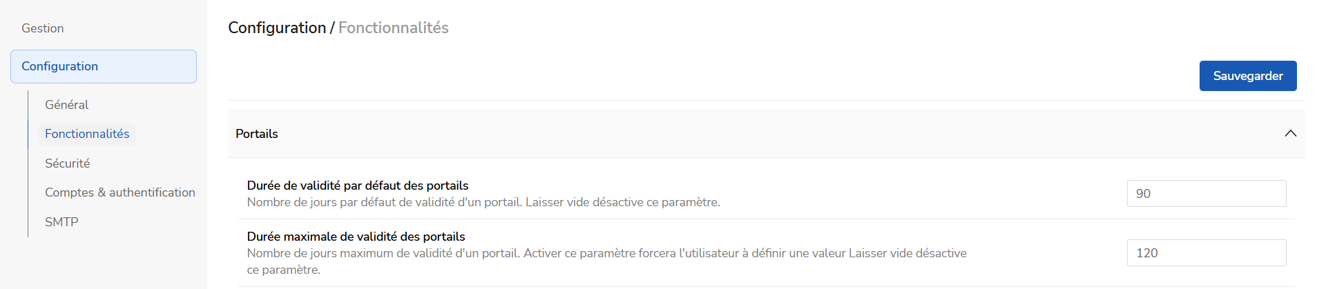 Durée de validité par défaut des portails : C’est le nombre de jours par défaut de validité d’un portail. Il faudra laisser vide ce paramètre si vous souhaitez le désactiver.
