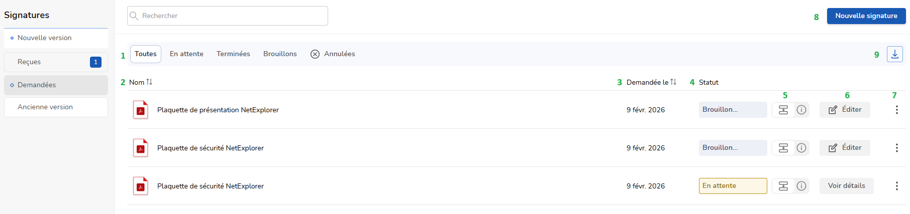 Cette zone permet de parcourir les différentes signatures que vous avez créées, en appliquant un filtre sur le statut souhaité (en attente / terminées / brouillon / annulées).