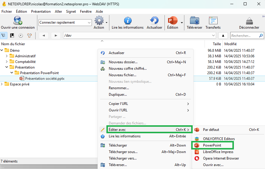 Suivez simplement le chemin d'accès à votre fichier, puis faites un clic droit sur celui-ci et "Editer avec", enfin chosissez le programme, ici PowerPoint.
